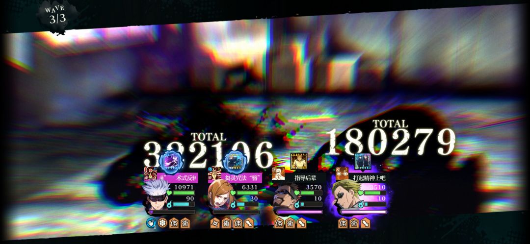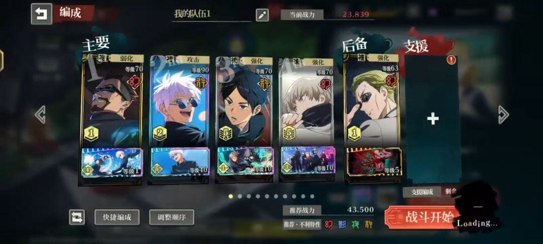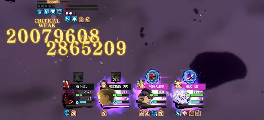 惠用2技能叠必杀条。 夜蛾叠buff。 夏油杰1技能。 紫5一直3技能。 强敌战途中没状态可以用夏油杰的樱花回一下,期间不断用1技能付与dbuff,五条继续用3技能边攻击边加buff。等5条必杀槽快满的时候(伏黑惠应该已经可以了),夏油杰用2技能附上dbuff,校长还是2技能。之后伏黑惠先用领域展开破防。这时候应该有人罚站了,先用校长的大招,再用夏油杰和紫五条的连携必杀(开回想)。