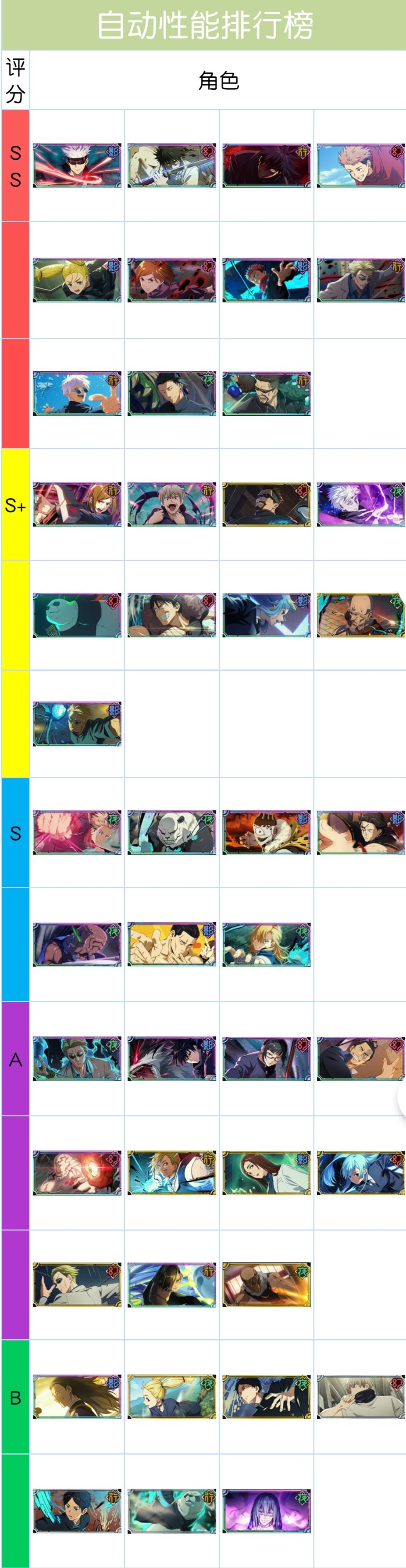 省流tip: 1.SSS级别的角色都推荐培养, 2.前期培养优先度先优先一般先每个属性培养一个属性拐外加一个输出。(有幻五和宿傩可无视属性克制直接无脑拉满),后期看XP培养。 3.目前真正限定角色(直到现在日服都没返场过)是影夏,已骨,行虎,幻五,还有宿傩。(其中幻五+宿傩组合可以让你无视克制硬推过的。优先级最高)这几个卡池遇到都可以直接拉起来的,因为错过要等到猴年马月了。其余都有机会复刻优先度没