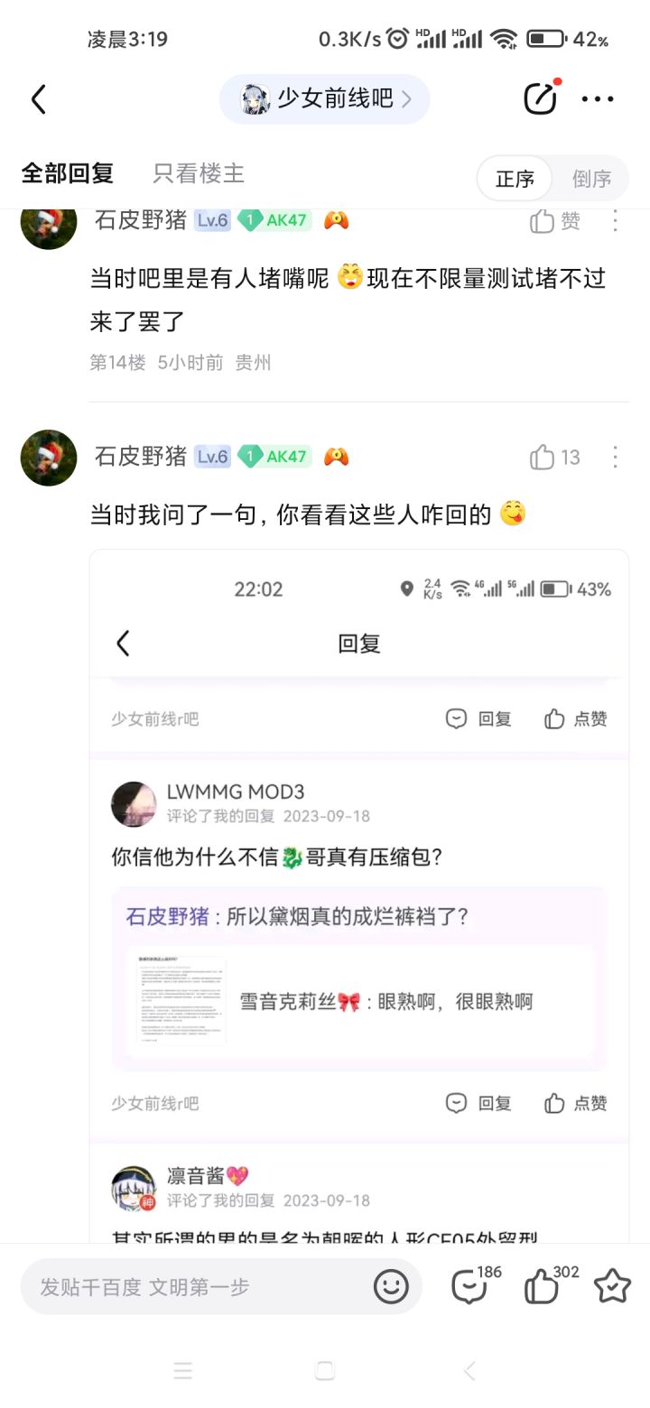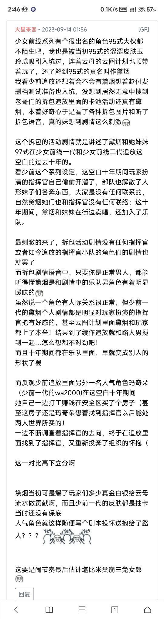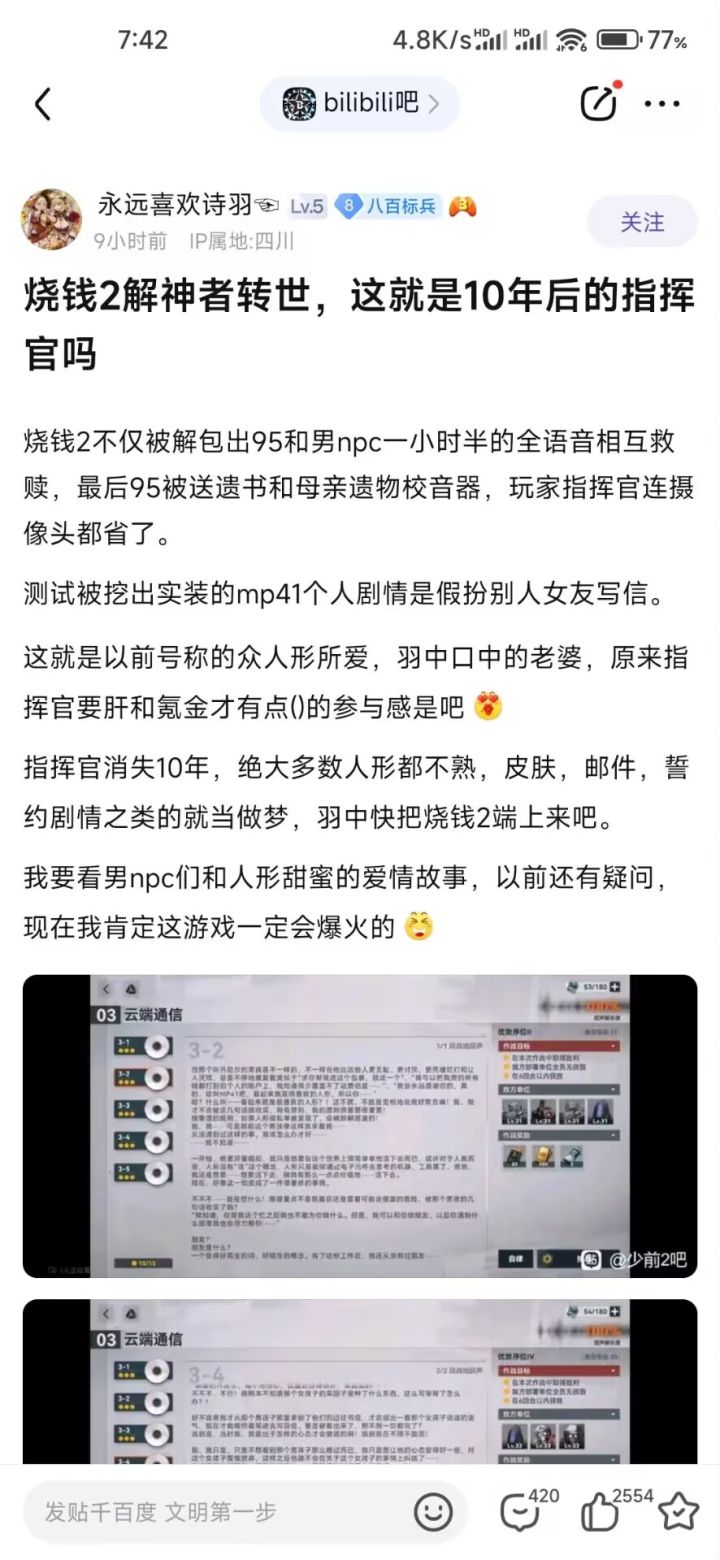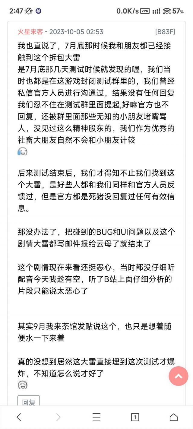 根据爆料,7月份95剧情的大雷就已经解包了,甚至反馈ym建议修改,9月18四测前又去贴吧说了一遍被普遍质疑删帖了。结果到这次测试又爆出来了还是没变化。说明ym早就下决心整这剧情玩切割了。那我只能祝ym游戏早日公测开服,大吉大利,流水滚滚。羽中健健康康,长命百岁了