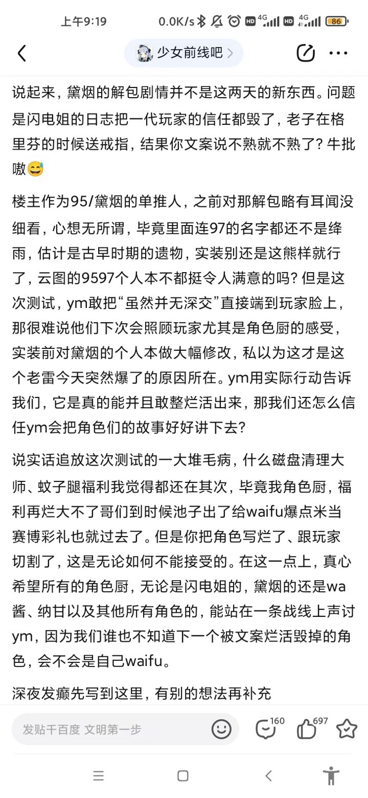根据爆料,7月份95剧情的大雷就已经解包了,甚至反馈ym建议修改,9月18四测前又去贴吧说了一遍被普遍质疑删帖了。结果到这次测试又爆出来了还是没变化。说明ym早就下决心整这剧情玩切割了。那我只能祝ym游戏早日公测开服,大吉大利,流水滚滚。羽中健健康康,长命百岁了
