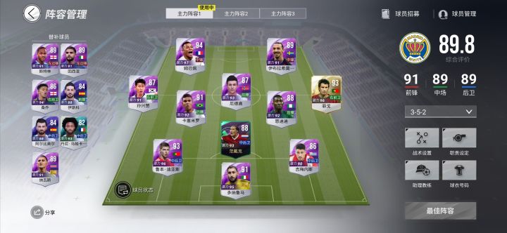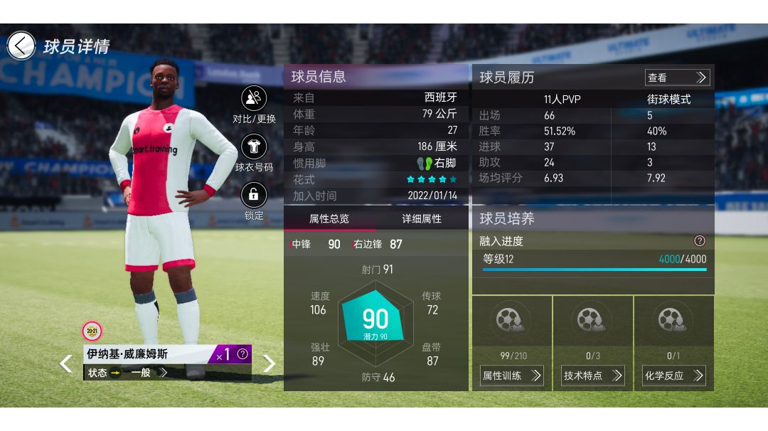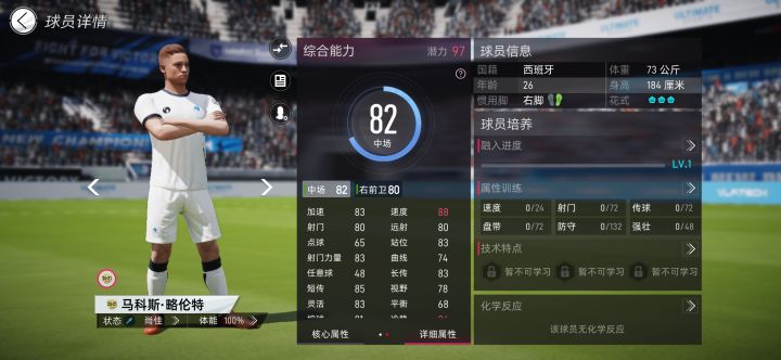 中场 马科斯•略伦特(最高97)作为中场,他的各项数据都相当平均,基本在80~上下,加上属性训练能达到+12,一般拉满能达到90以上的能力,用起来比大部分中场球员都舒服,由于数值的平均,因此防守的积极性也挺高,丢球之后回抢拦截都能及时做到。梅森•芒特(最高99)作为中场,其传球和盘带相对较低,但是也勉强接近及格线(78、79),但是注意看梅森的属性训练是+20,拉满之后比马科斯还要再高一点,如果