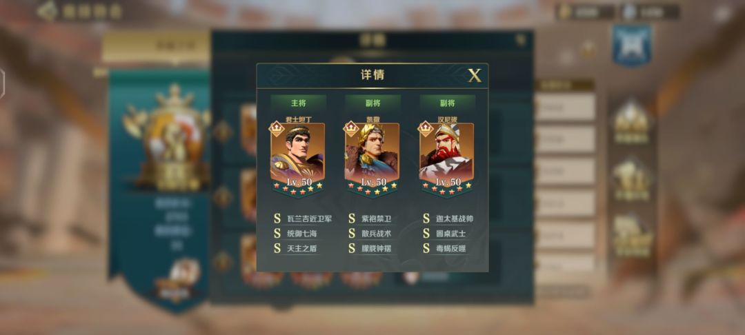 #文明共创第四季# 大家好,我是战略学院季沧海,本期就来讲解讲解s1毕业的反击队,也就是汉尼拔队伍,反击队作为大佬必备,平民慎重的队伍,建议大家要着重考虑 如图 这是最标准的反击队 君坦吃伤害 凯撒回血 汉尼拔输出 但是,最重要的是各种技能的联动性,才能保证汉尼拔的输出最大化 君坦 携带统御七海 天主之盾 这二者只有统御七海才能替换成盾墙,但是会大大的减强度 凯撒 携带散兵和钟摆 提升汉尼拔伤害