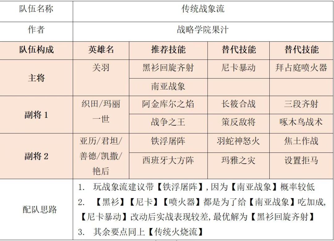 1.关羽 关二爷可以说是游戏中上限最高的英雄,并且门槛较低,玩法多样,即使用一些较普通的技能也经常会获得不错的战果。本贴汇总分为【传统火烧流】【传统战象流】【暴击流】【被动点火流】以及【铁三角】等玩法