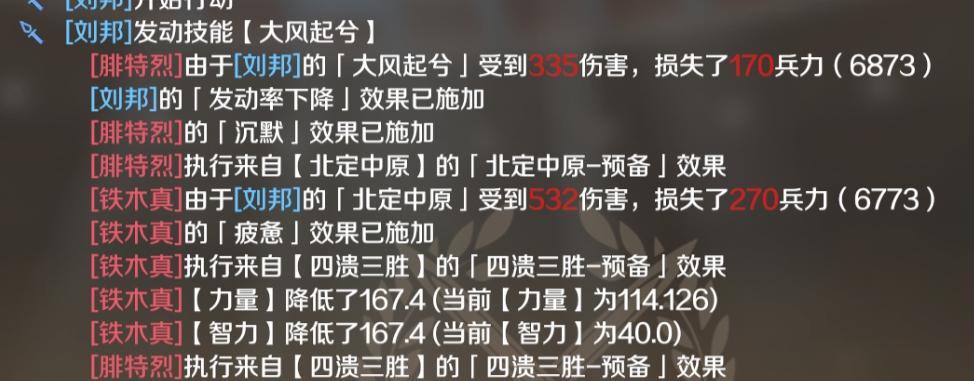 【战略学院】顾辞~ 关注抖音,直播配将~ 抖音号:1685523385 #文明与征服半周年# #文明与征服s3赛季# 1.技能介绍 战斗中每回合,我军全体每对敌方施加一级控制状态,即可获得一个【霸王】标记,然后对敌军发动一次物理攻击,并消耗全部【霸王】标记,每消耗一层标记就会吸取攻击目标6点的属性,持续5回合,并且消耗4层标记,即可净化自身。同时若自身处于一级控制状态,本技能伤害将降低50%。 浅
