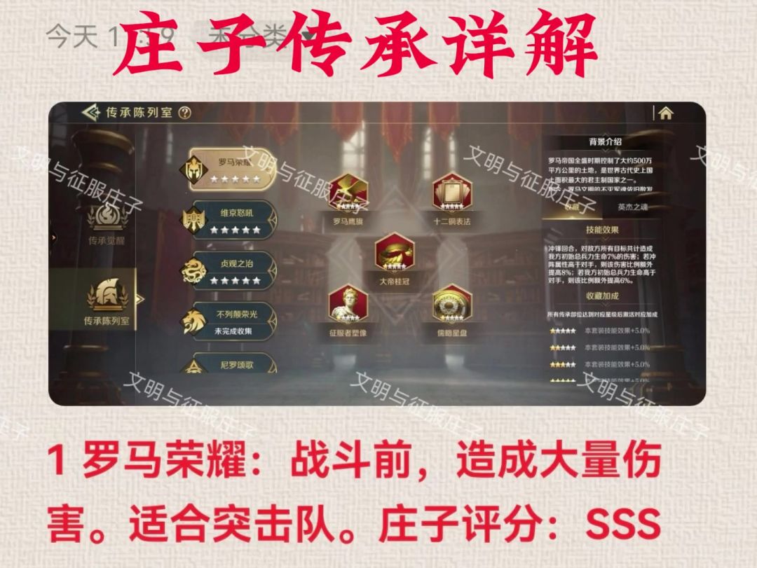 很多粉丝,我看氪传承都氪错,庄子今天给传承做了一个评分,大家一目了然,三个SSS,四个SS,一个S.共计:8个传承。#游戏种草计划#文明与征服庄子配将