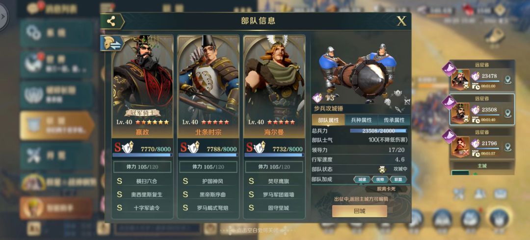 #文明共创第四季# 大家好,我是战略学院季沧海,本帖给大家讲解s1的纯突,纯突作为人口收割机的存在,是s1中打战功最轻松的队伍,但是也是作为不能群架的队伍,如图,讲解开始 纯突通常用,红胡子 萨拉丁 理查组成,其中 红胡子和萨拉丁担任输出 理查作为队伍辅助的存在其本身的主技能也不适配任何突击技能 红胡子带最适合的诺曼和高卢 诺曼可以带来回复和连击效果 配合本身主技能和高卢打输出,同时担任主将,不容