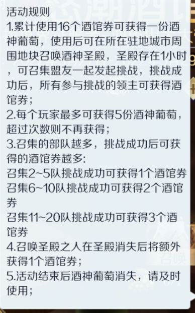 S3来了,而冲榜奖励变成新英雄亚瑟王。官方也新出了一个活动——怒潮酒馆,来获取S1S2的冲榜英雄亚历山大。 开启时间:第一次为开服前10天,后面变为每周五——周天 规则 酒馆券可以做任务获得也可以挑战酒神圣殿,除此之外限时累充在活动期间内最后三档奖励也可以获得酒馆券 不用氪金也能把80个酒馆券拿到 酒馆券抽奖礼包总共分三个奖池,分别是葡萄酒,朗姆酒,麦芽酒 葡萄酒奖池可以抽5次,可以获得觉醒亚历山