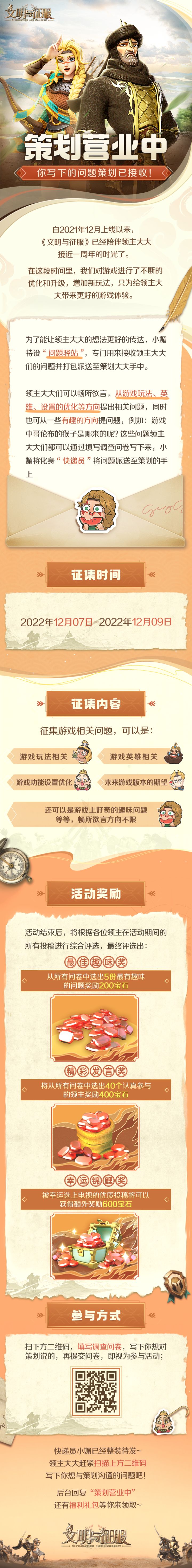 领主大大们在游戏过程中是否遇到过让自己困惑的问题?现在文征策划正在营业中大家可以前往小媚的“问题驿站”填写问卷提出自己的疑问优秀问题还有机会获得超多宝石和福利礼包哦~