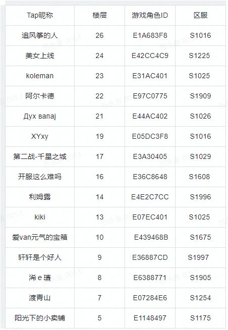 【活动时间】4月1日-4月7日【领奖时间】4月14日-4月21日【获奖名单】恭喜第5、30、115层的领主大大获得【50元京东卡】一份!请获奖的领主发送【姓名+身份证号码+TapTap账户主页+楼层截图】至wmyzfxzs@163.com领奖哦~恭喜第100、67、45、49、117层的领主大大获得【游戏周边充电宝】一份!请获奖的领主发送【姓名+身份证号码+收货地址+电话+邮编+Tap