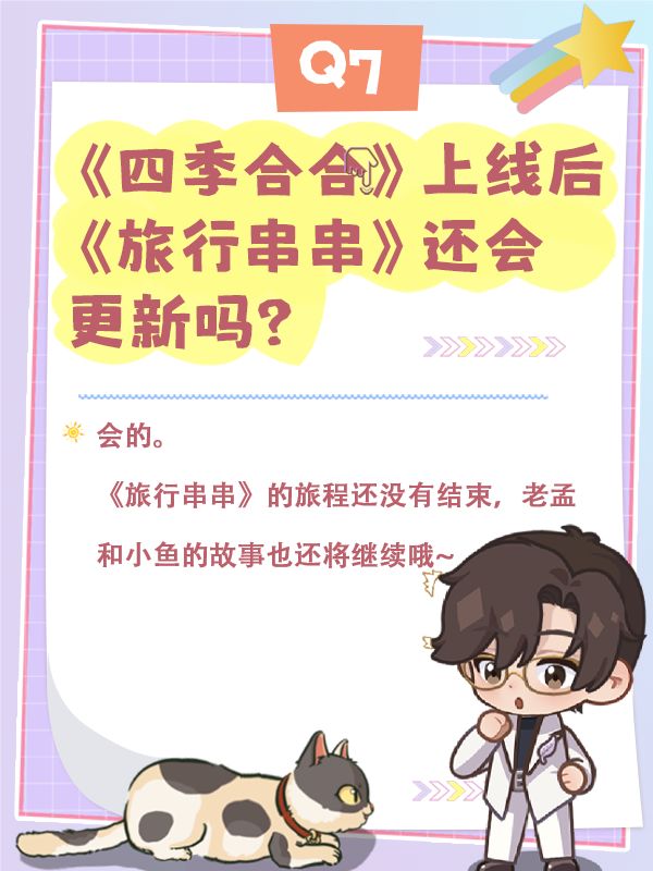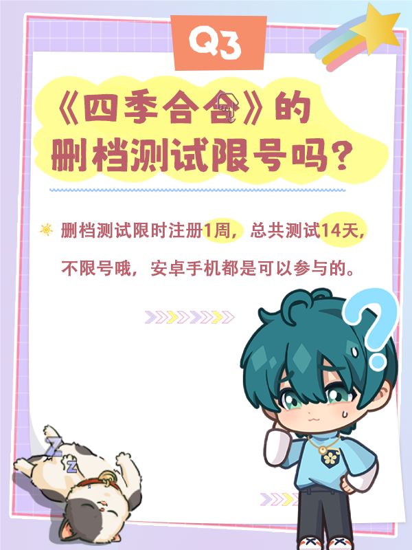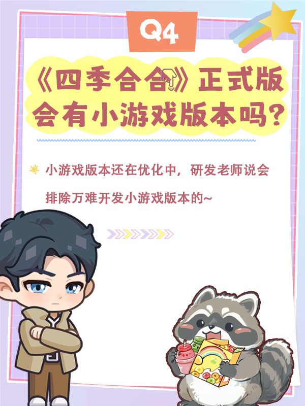 营业后,茶宝(很快大家就会在游戏中认识我哦~)感受到大家对合合的期待和热情啦~整理了一下几个大家感兴趣的问题,在这里回答一下~Q1 《四季合合》什么时候上线?A1 《四季合合》将先进行一次删档测试,方便开发者们发现游戏中的一些问题,收集大家对游戏的各种建议与反馈,待游戏调优完成后就准备正式上线啦!Q2 《四季合合》什么时候开始测试?在哪个平台测试?A2 《四季合合》预计在11月下旬删档测