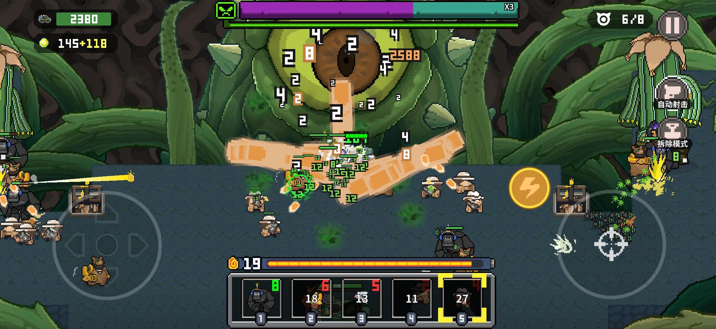 蜜蜂巢穴,选加特林黄蜂。过关属性选攻击力+5。(加特林蜂多段攻击,攻速可观,固定攻击上去了,伤害很夸张,也可以选用木豚水鱼+10攻击力 +5格挡)补给储蓄到六级选加成,横扫八方。加上米老鼠,范围索敌能抗能打(虽然是白卡,真的很好用)肉盾前期可以用黄金鸡补经济,后期无脑换初代鸡(最强肉盾之一)角色方面看个人喜好,我喜欢狙击鹰,肉盾+100%生命值也很舒服。前期米老鼠就可以无脑通关米老鼠+