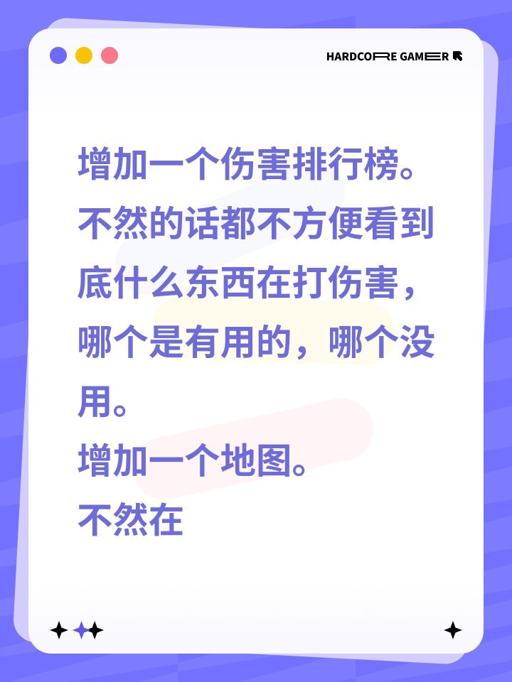 增加一个伤害排行榜。不然的话都不方便看到底什么东西在打伤害,哪个是有用的,哪个没用。增加一个地图。不然在那放牌的时候真的很费劲,我得先走过去才能放。这两个比较影响体验,建议增加。