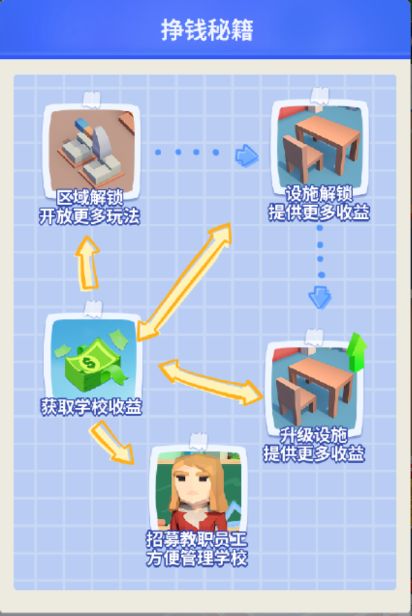 下图展示了《学校模拟器》中大致的经济循环: 下面将详细描述游戏中金钱的来源与支出方式。游戏里只存在一种货币,即金钱。 1.金钱来源①设施学校里可以建设各种各样的设施,而部分设施可以提供持续性的收入。游戏里的6:30-22:30时间段,每到整点结算1次(如7:00)。 建议:如果想提升收入,前期尽快扩建教室以及建造教室内的各种设施和食堂内的装饰用设施,中期可以适当升级教室设施,