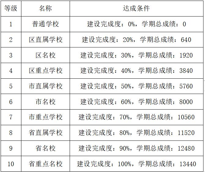 我们管理的学校具有等级制度,等级的评价标准有2个:· 建设完成度:学校内建设、升级的设施越多,建设完成度就越高· 学期总成绩:学校内的学生越多,任课老师的属性越高,则学期总成绩越高 以下是每个等级对应的达成条件: