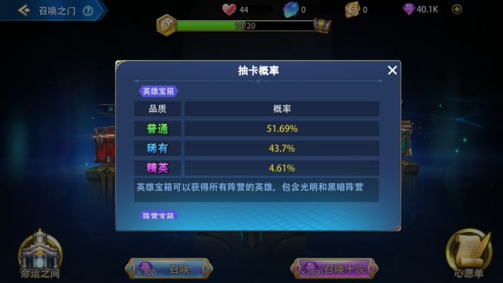为了让大伙更好的了解万界英雄,本篇内容以QA的形式为大家介绍下游戏中的各大板块,强烈建议收藏本系列内容,可以随时翻看解答疑惑,让我们开始吧!【召唤之门】Q:我们能看到具体的概率吗?A:当然可以啊,这个是透明公开的,玩家们可以点击在召唤之门里面的左上角“?”图标查看具体概率。Q:召唤石的使用方式A:玩家可以直接点击主界面【召唤之门】按钮打开【英雄宝箱】界面点击按钮使用召唤石进行召唤Q:召