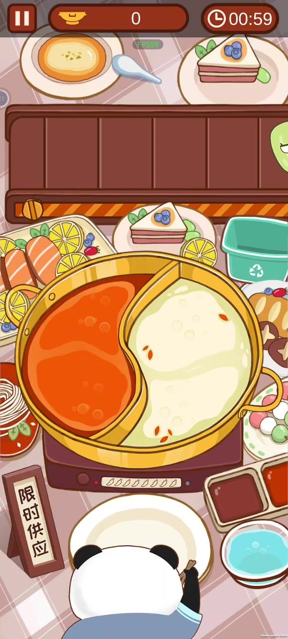 这个火锅游戏就是把食材放进锅里,熟了就放到熊猫的盘子里让熊猫吃,有鸳鸯锅 辣的下面有辣椒值 够了得让熊猫和一口水 如果食材融进锅里几次就不行了 也得靠手速哇