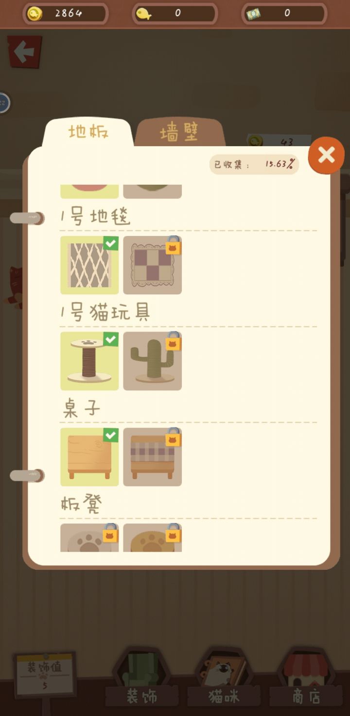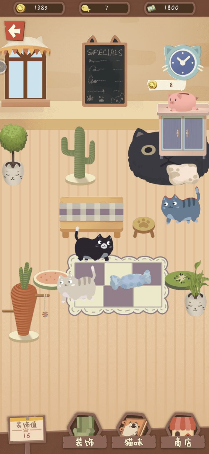 3、猫舍,看着满屋子的家具和猫猫,真的是吸猫一时爽,一直吸一直爽,我要解锁所有家具和猫猫,收集控的福音