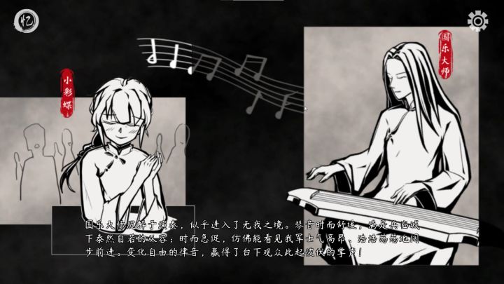 采用民国风结合黑白版画而产生的新艺术风格,视听互动辅助于叙事的一部互动视觉小说游戏。讲述了架空的战争背景下,热爱音乐的小彩蝶和小次郎由于国别和文化等差异,对和平抱有不同的思考,终究没能实现合奏的悲剧故事。传达出强烈反战思想,希望引起玩家的共鸣。
