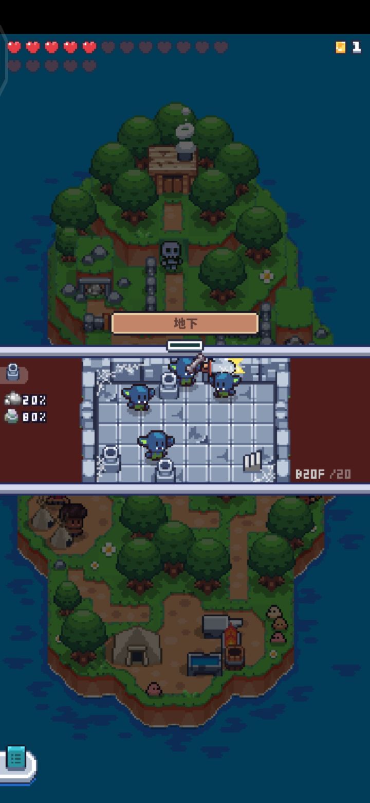 6.最后一步,探索地下的最低要求是斧头4级,稿子3级,铲子3级,剑等级无要求(体力最好有12个,越多越好),之后就要去上面的小木屋,小木屋有一个地洞,下去后会有史莱姆(要4级剑)和罐子(要3级稿子),玩家先不要管怪,直接去敲罐子(敲的时候你是无敌的),敲完后点击上下楼层的标志,不会因为靠近怪物而打断走路,罐子会刷木头石头,铁,铝,速度远远比在矿洞处的效率高,可以通过反复上下楼层刷新罐子和怪物,在血量低的时候就退出去,回帐篷补充血量,在地下重复操作,将剑升到4级,就可以一刀一个小朋友,地下是每4层怪物都会变得更强,玩家需要重复上诉操作先升级稿子,挖罐子弄材料,然后升级剑杀怪,重复n次,用血量换物资,因为越到下面罐子里的东西就越多
