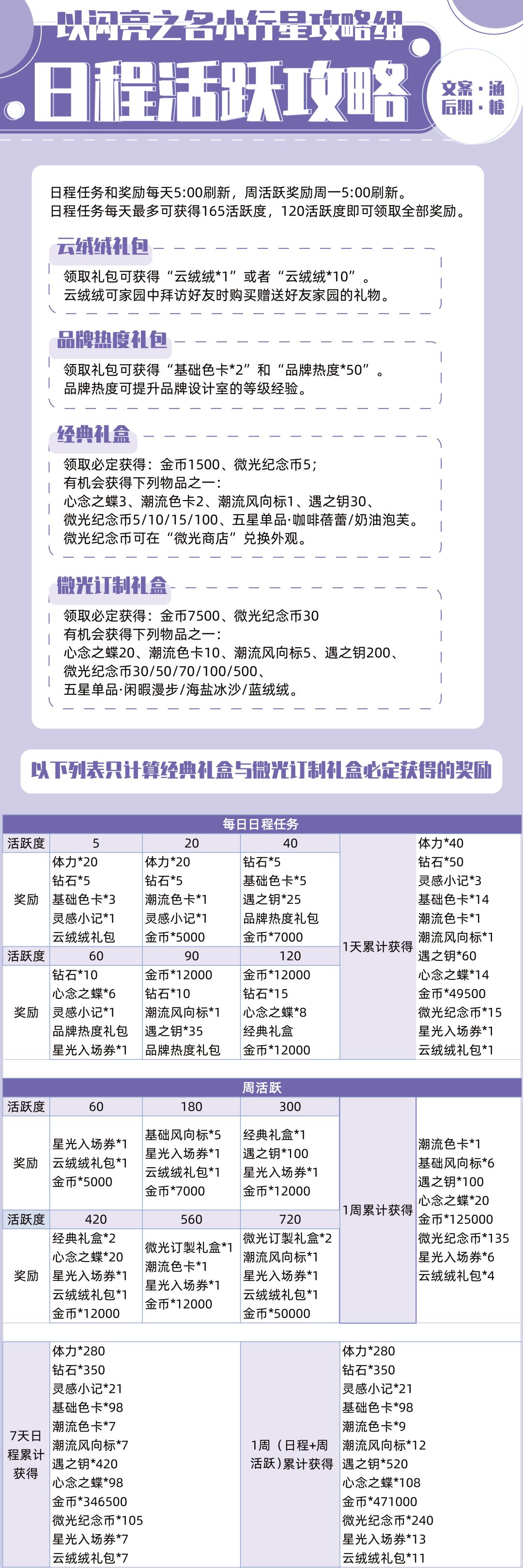 我们是【非官方】以闪亮之名小行星攻略组,以闪亮之名3月24日公测,各位合伙人快来看看日常活跃都能拿到哪些奖励吧。包括云绒绒礼包、品牌热度礼包、经典礼盒、微光定制礼盒的介绍,以及每日日程任务和周活跃,列表只统计经典礼盒和定制礼盒必定获得的奖励哦。 注意:云绒绒的用处为可以在家园中拜访好友时购买赠送好友家园的礼物。建议点击原图查看 紫色为简体版,橙色为繁体版。 ps:以上内容为台服总结,详情以国服为准