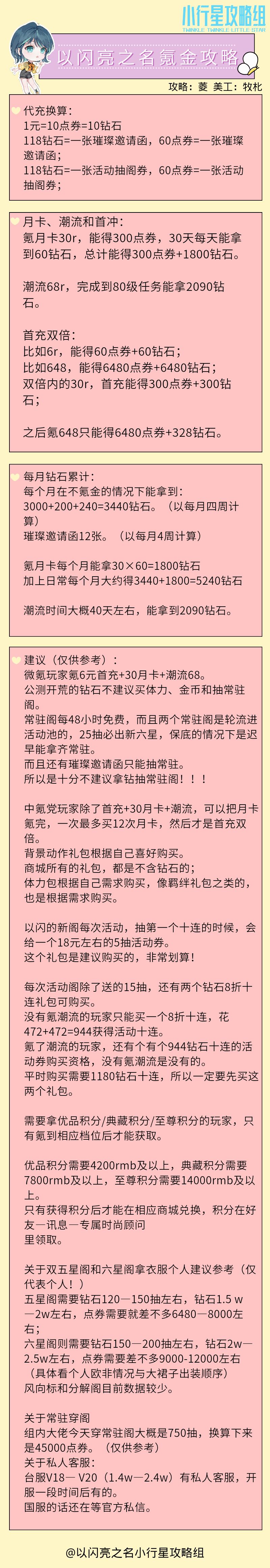 主观成分较多,如果有不同建议可以提出 记住:不要用点券换钻石!!! 璀璨邀请函只能抽常驻! 以闪亮之名的免费套装也是很好看的,不氪金能玩,靠主线和心意之期的衣服是能过关。 不太建议开服拿钻抽常驻,开荒过后每个月存钻石3440左右,加上月卡是5240。 氪金分为三类: 1.0氪党 2.首充6元+月卡,潮流不太划算,根据自己喜好购买(首充不是套装是散件)(潮流里的衣服也是散件) 3.首冲6元+月卡+