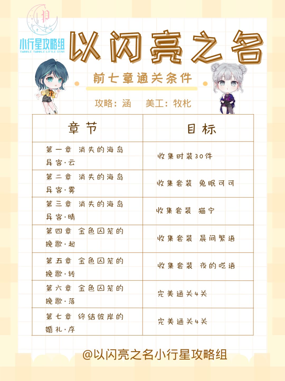 我们是【非官方】以闪亮之名小行星攻略组,以闪亮之名3月24日公测,前七章通关条件已经标出,帮助大家快速推关哦。 第一章:消失的海岛异客·云 本章目标:收集时装30件; 第二章:消失的海岛异客·雾 本章目标:收集套装 兔眠可可; 第三章:消失的海岛异客·晴 本章目标:收集套装 猫宁; 第四章:金色囚笼的挽歌·起 本章目标:收集套装 晨间繁语; 第五章:金色囚笼的挽歌·转 本章目标:收集套装 夜的呓语