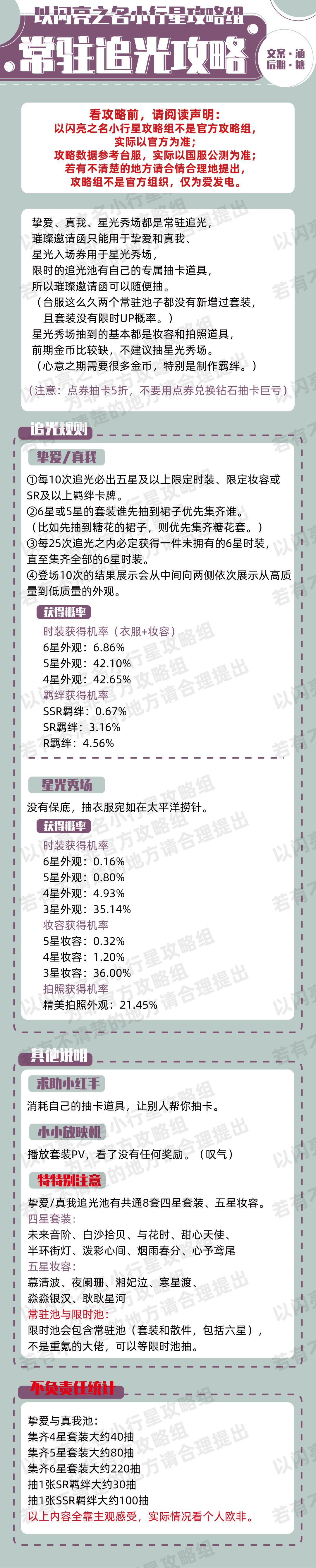 我们是【非官方】以闪亮之名小行星攻略组,今天小行星带来挚爱/真我追光攻略 ①每10次追光必出五星及以上限定时装、限定妆容或SR及以上羁绊卡牌 ②6星或5星的套装谁先抽到裙子优先集齐谁。 (比如先抽到糖花的裙子,则优先集齐糖花套。 ③每25次追光之内必定获得一件未拥有的6星时装,直至集齐全部的6时装。 ④登场10次的结果展示会从中间向两侧依次展示从高质量到低质量的外观。 ps:以上内容为台服总结,详
