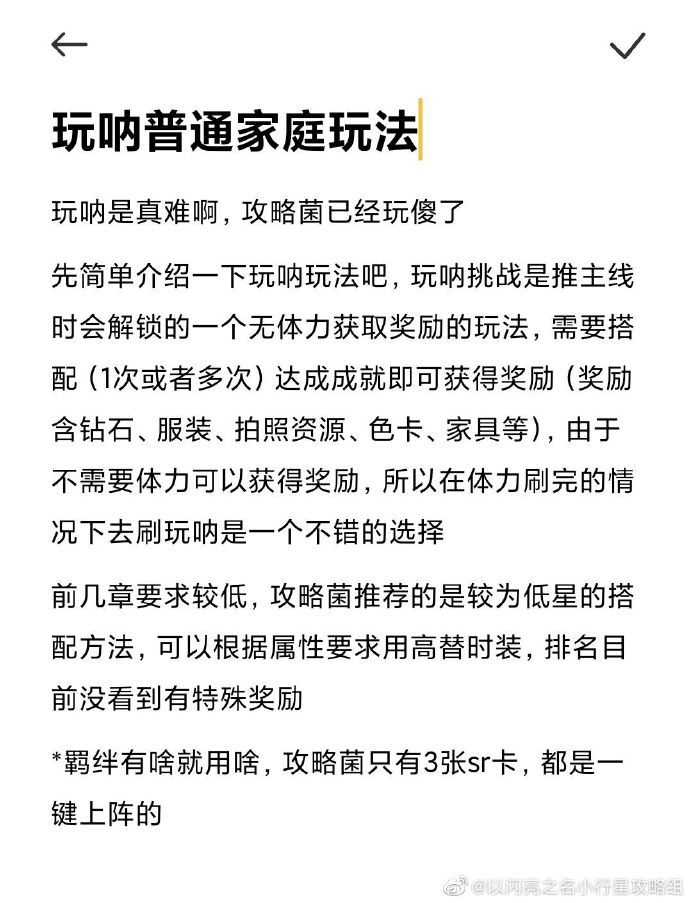 玩呐前期还是比较简单的,就是比较麻烦点 有些通关需要特定颜色,需要染色。具体可以去看小行星的玩呐攻略。本人是懒的看攻略一个一个去试没有在去染色,染色三星四星就可以用。用的最多感觉就是这个芳菲尽。玩呐和主线加分最高的应该是标签第二是主风格其次次风格。最后羁绊第九章开始要选择手动,比如9-5这关我用r卡30级一心跃动过的。羁绊R卡也不建议升太高级拿点奖励就好了,资源主要还是给进化的SR卡或者SSR卡#我为以闪亮之名代颜