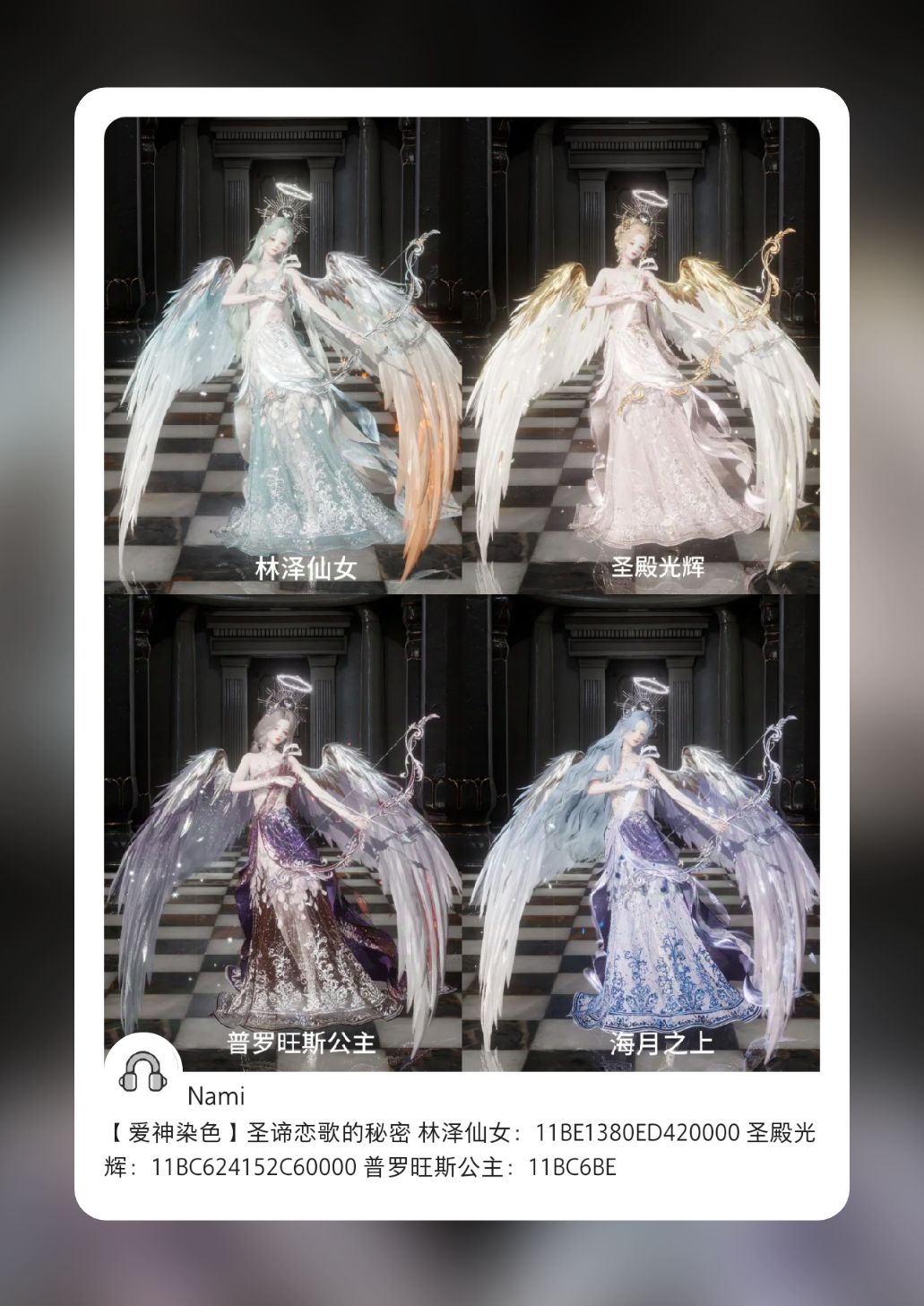 天使复刻啦!这个染色贴很多人喜欢,也搬运过来,方便小伙伴们查看。(作者是我) 林泽仙女:11BE1380ED420000 圣殿光辉:11BC624152C60000 普罗旺斯公主:11BC6BE95D060000 海月之上:11BC6A6650020000 #以闪亮之名 【衍生穿搭】(笔记可直接搜名字) 波斯秘教:11BED22EF5840000 塞壬幻紫鱼(可自行搭配普罗旺斯公主的翅膀变成飞鱼)