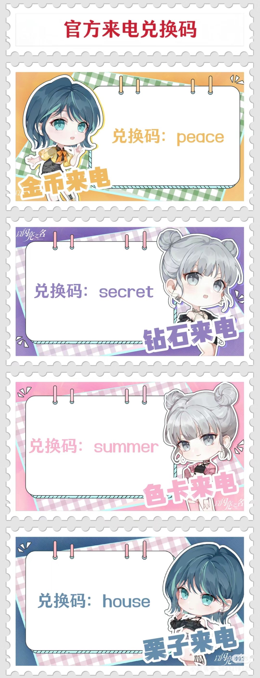 昨天直播今天抬以闪你好快(含钻码) 话不多说昨天直播没有掉落钻码 今天输入以下兑换码可以兑换: 金币兑换码(88888):peace 栗子兑换码(5000):house 色卡兑换码(50):summer 钻石兑换码(100):secret 对的没错就是单词 今天上线就可以领六星啦 #以闪亮之名 #以闪亮之名以实力证明 #以闪亮之名鸢舞之羽