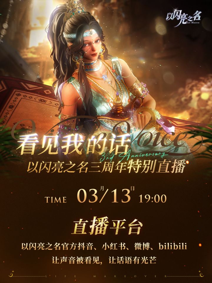 以闪亮之名的三周年,我们远赴千里之外,探寻千年以前。我们试图寻找一种方式,让每一份真诚的表达都不再湮没于人海,Visible Voice 看见我的话,让表达连接你我,让目光在此刻相遇。本次直播,我们一起去一个超级浪漫的地方吧!(*╹▽╹*)PS:⬆️荔枝喵说不加这句就一直打滚直播时间:2026年03月13日 19:00直播平台:以闪亮之名官方🎵、🍠、🧣 、B站TAPTAP:以闪亮