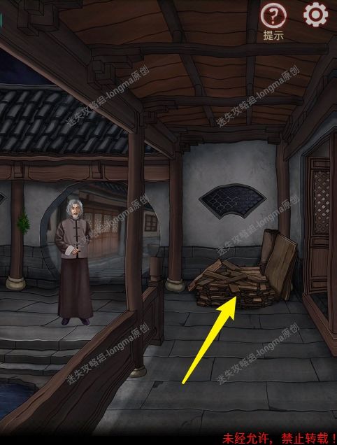 第四章:深院 1.(通道)点击木板堆,完成小游戏(一直点那个按钮,手速要快),获得【长木条】 2.(大堂)点击桌子,查看上面的书,获得线索(化凶为吉方法:烛长明、顺灵位、计财数、见山不见水) 3.点击右边的挂画,收起来,在暗格里面获得【字牌】 4.把【字牌】放入凹槽处,调整字牌使对联拼成一句诗(鹤驾已随云影杳,鹃声犹带月光寒) 5.点击拾取桌子上的【火折子】 6.(左边-房间)点击衣架上的衣服,注