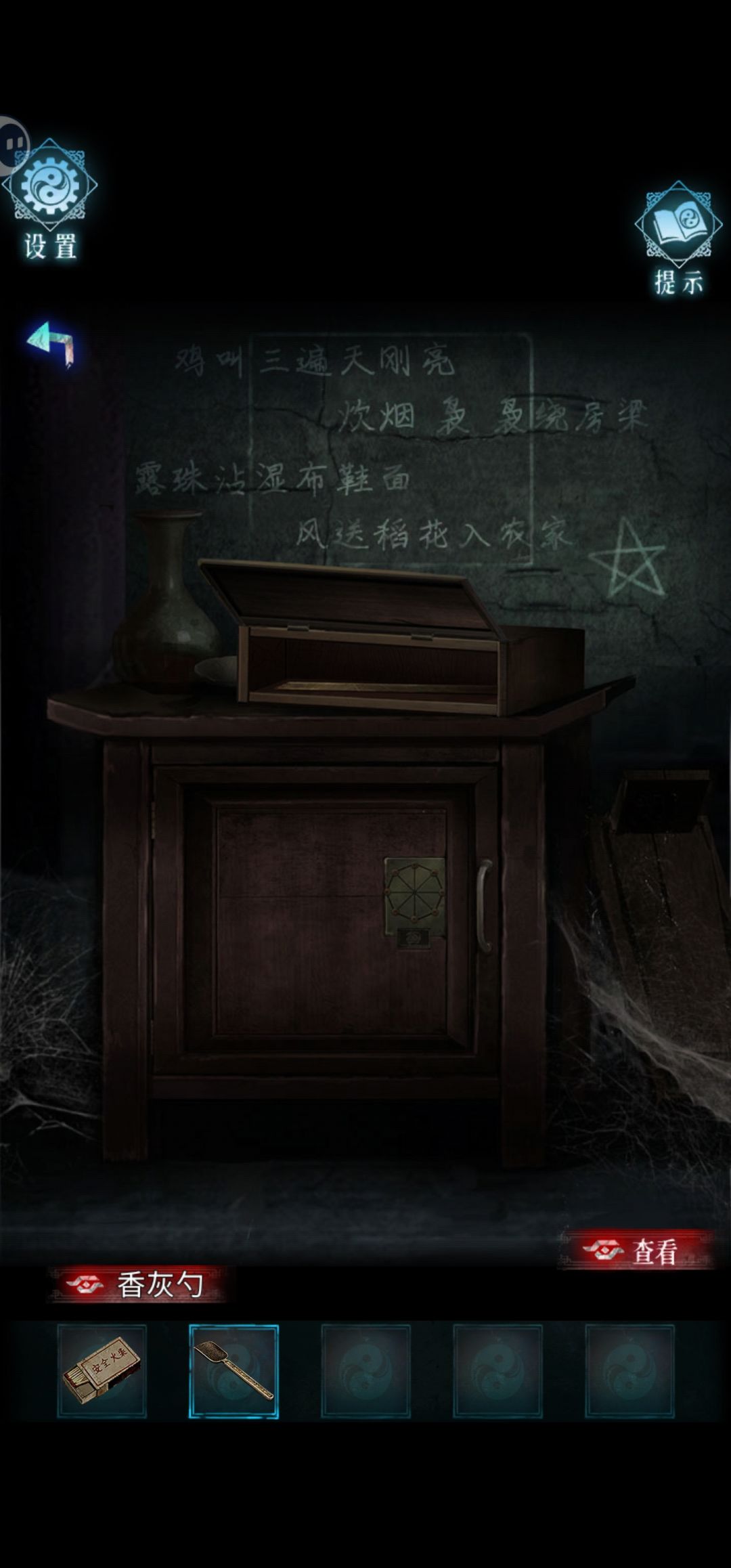 第五章攻略 1.观察门上的图案,将水流变为只有朱雀和玄武相连(南和北,小游戏玩法:先点东,再点西),打开石门出去。1 2.来到过道,观察天花板上的特殊符号。2 3.向前走到路口,继续向前进入婚房。3 4.点击左边的箱子,根据天花板上的图案,结合箱子上的图案,得出密码(类似于:FnSPR,S是根据箱子上的图案加上去的),输入锁上,打开箱子得到【奇怪部件】和【火柴】。4 4.1 5.点击右边柜子,记住