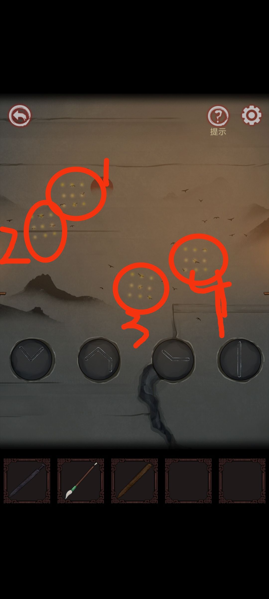 进去后吧蜡烛点上,仔细看墙上,1号八个亮光点像九宫格图形里面几只大雁所在光点,1有四只大雁,细看这四只大雁形状,以此类推,最后这个随便转转就能解开了,解开后记得看地上书翻到最后一页拿符,先不要解除封印,拿到符 把木质剑按在梯子上,点击井口,会让你选择是出去 还是不出去,肯定是选出去,出去,后是第一个结局,还有个结局,最后一个局就要画符了