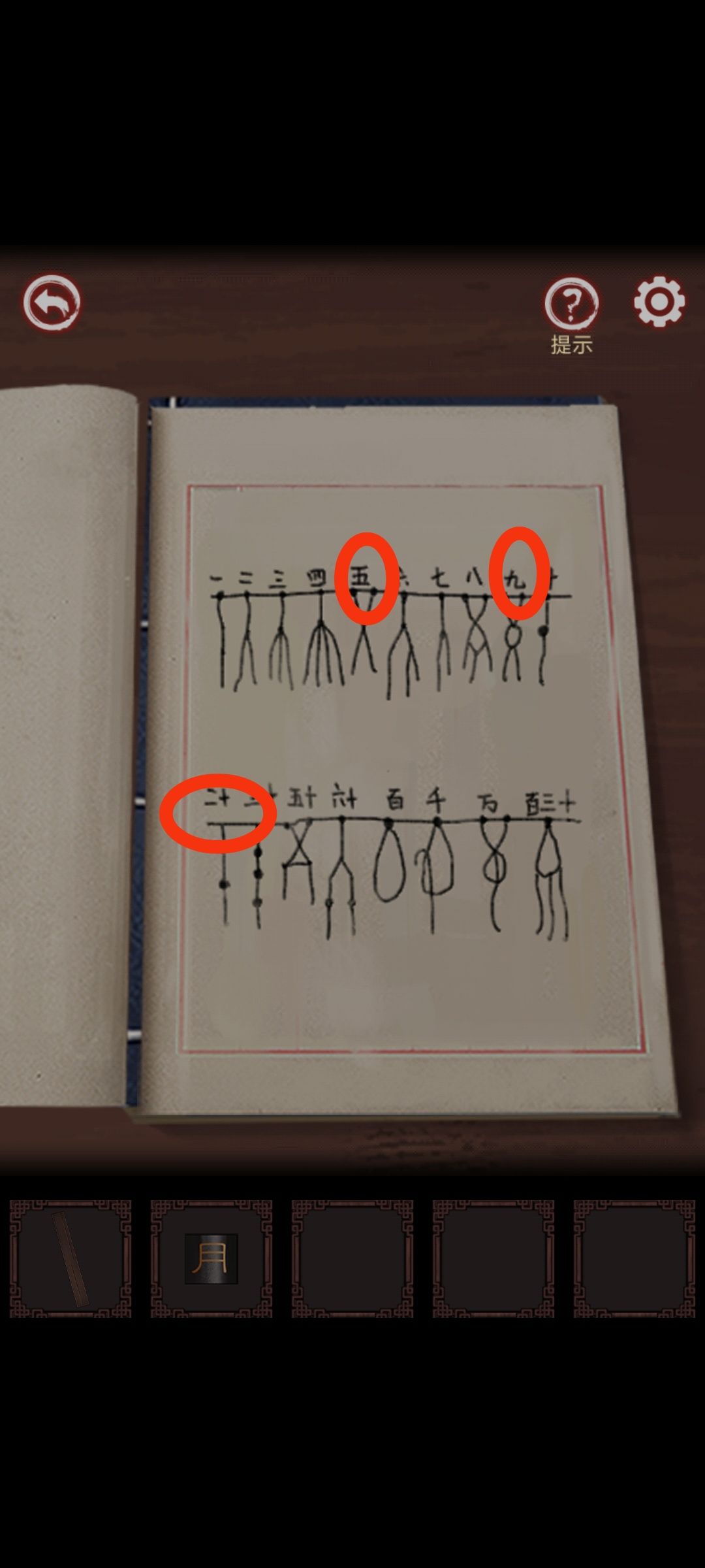 解开小盒子,发现一个坏掉的棋谱纸,先拿着,继续点后院房子,注意看房子上面眼睛👀是解开这个房间锁的关键,锁我已经把正确三个打上去,还有最后一个怕打上去了截不了图,解开锁,不要急着进房间,回到大厅,我画红圈那去亭子吧绳子拿了再进房间,把绳子装在水井,再进房间锁的第三个我弄错了,不是这个,你们自己摸索吧