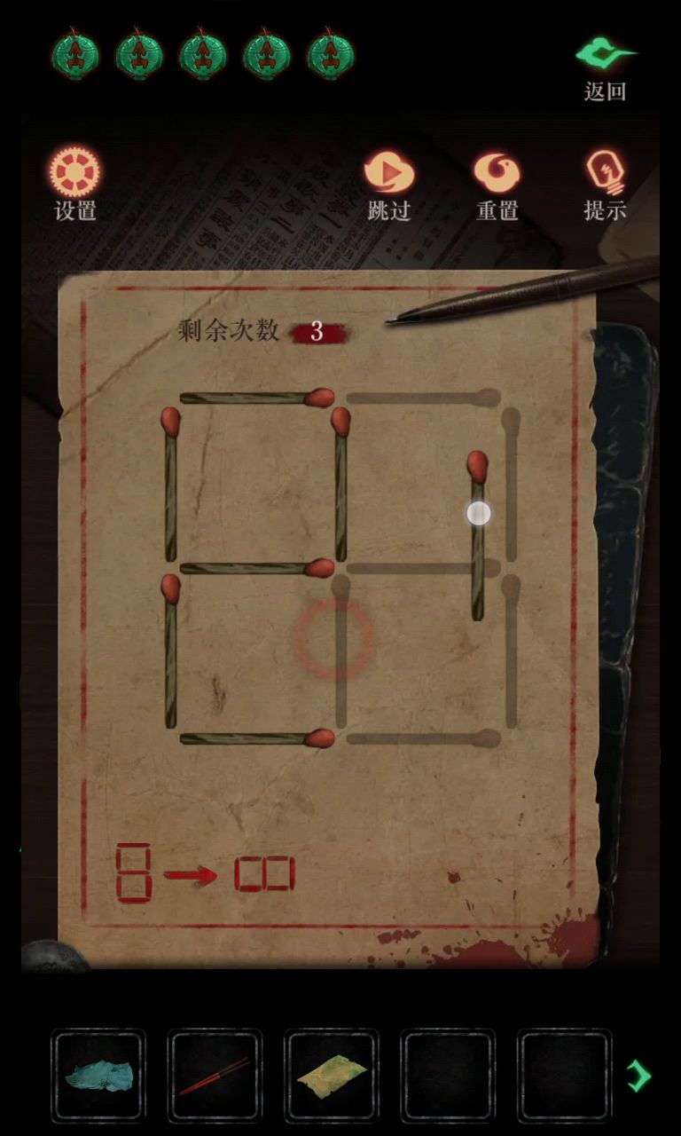 🌈🌈僵尸线 ✅第一章 62.点击靠近棺椁,第一具尸体口袋里的牛皮纸,第二具尸体上的破衣服,和第三具尸体脑袋下的筷子。62 63.向左走,来到一摊沙子的地方,点击尸体捡起旁边的胶水,用破衣服包裹中间的沙子,得到一堆沙子。63 64.继续向左走,来到绿色明冥火处,点击右侧红色的箱子,按要求摆好火柴棍,得到一把大砍刀。64 65.点击向下的箭头,乘坐小船来到岸边,拿到一把铁剑。65、2 66.回到坐小船