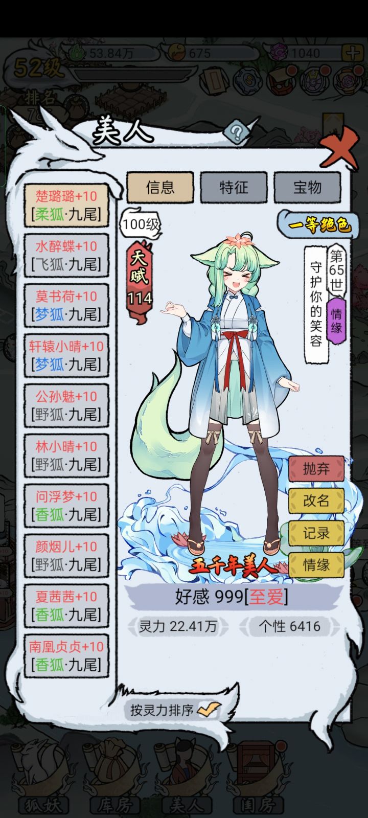 还有受争议的广告问题,最初我玩的时候全是视频广告,已经刻进DNA里了,也有浏览广告,但最近视频广告变少了似乎,算是暗优化吧?一开始游戏的期待很高,光是看着宣传图里的狐妖画风就感觉很喜欢,大家应该也是这么觉得的吧?至少玩的很多人都是为了老婆来的,背景中的ui其实就暗示了实机,看见很多人觉得不是自己想的那样的ui,我觉得ui这方面对此类游戏来说不会太影响(能看就行)重点其实不应该是这个,养成和恋爱,立绘是这款游戏的卖点,从养成方面看,基础的养成方式和其他不同的养成点以及离线收益其实都是说的过去的,至少这方面优化得不错,养成有失败也是可以的,周期中规中矩,就是结局有丶离谱