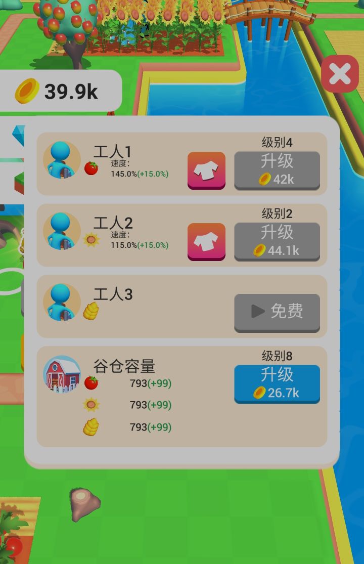 第一幅大图总共7块区域,开区域需要两个前置因素,地皮数和金币都达到才能开新的区域。一般来说开土地的顺序是商贩>仓库和仓库前面的地(升级仓库要用)=种地的地(每种一块就够了)>树蜂蜜和牛羊鸡。至于大马路,能走别的路过就不用开,开新地形缺地皮去开就行了。一般仓库开了之后直接招工,前期一级工人就够了,19级的仓库容量差不多一觉睡醒刚满(仓库三件套看广告都开,性价比比较高,并且能带到别的区域)前期不