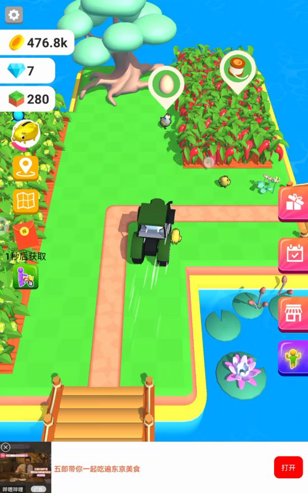 第一幅大图总共7块区域,开区域需要两个前置因素,地皮数和金币都达到才能开新的区域。一般来说开土地的顺序是商贩>仓库和仓库前面的地(升级仓库要用)=种地的地(每种一块就够了)>树蜂蜜和牛羊鸡。至于大马路,能走别的路过就不用开,开新地形缺地皮去开就行了。一般仓库开了之后直接招工,前期一级工人就够了,19级的仓库容量差不多一觉睡醒刚满(仓库三件套看广告都开,性价比比较高,并且能带到别的区域)前期不