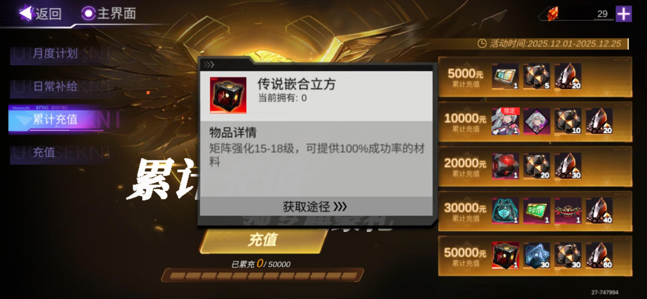 副本奖励一言难尽,估计可能是准备让玩家春节多自留点钱吧。累充15-18级的强化材料搞不明白,是让玩家先把单个矩阵升到15级再用这个强化到18级?应该不是给多个矩阵强化到18;还有可笑的金色戒指。1280的一个,你就说买不买吧!加附加20%护甲穿透,15%闪避。你不是闪避不够吗?那就换这个戒指,不要3万,也不要5000,只要1280,搞不好下个月还来一个。