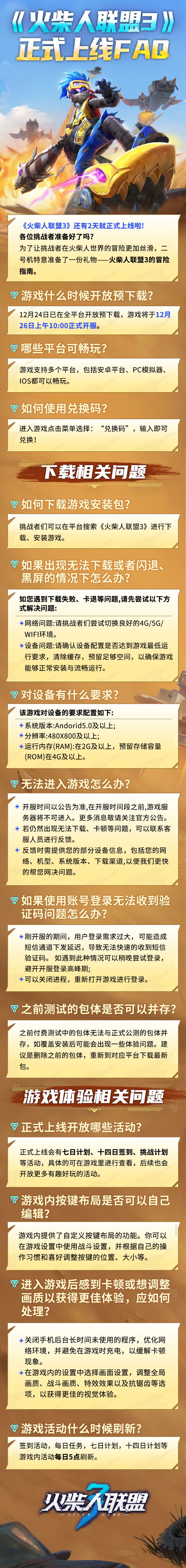 《火柴人联盟3》12月26日全平台首发,想必各位挑战者对游戏有不少疑问,二号机(嘻嘻~~)特别为大家整理了一份的FAQ帮助指南,大家遇到问题可以看看是否能找到满意的答复!各位挑战者:如遇到历史参与过测试,提示安装最新安装包无法进入游戏的用户,建议删掉已有安装包,重新在下载测试包的应用商店下载,已下载最新安装包的用户不用重复下载。注意:可以进入服务器界面提示12月26日10:00开服为最新安装