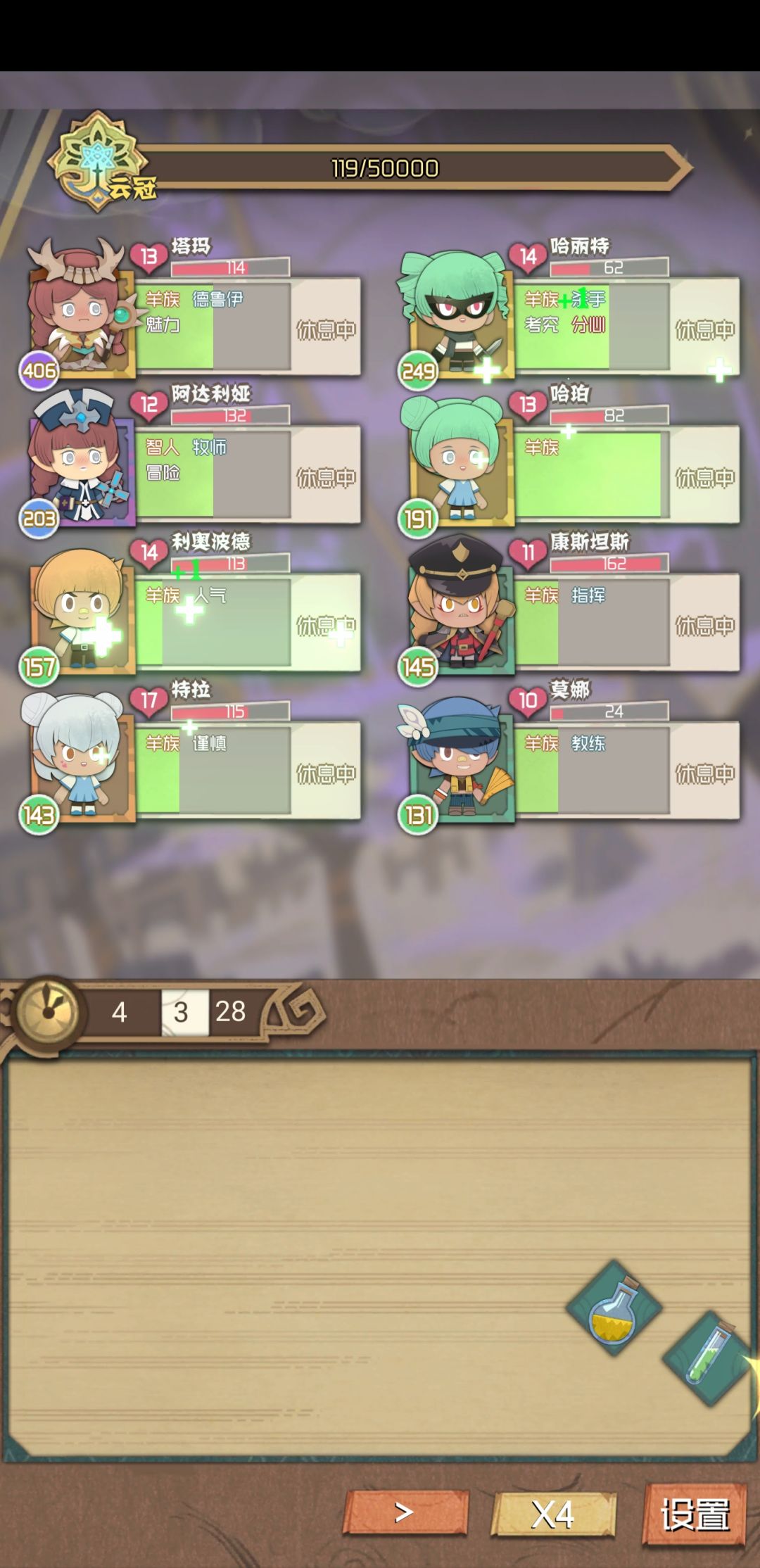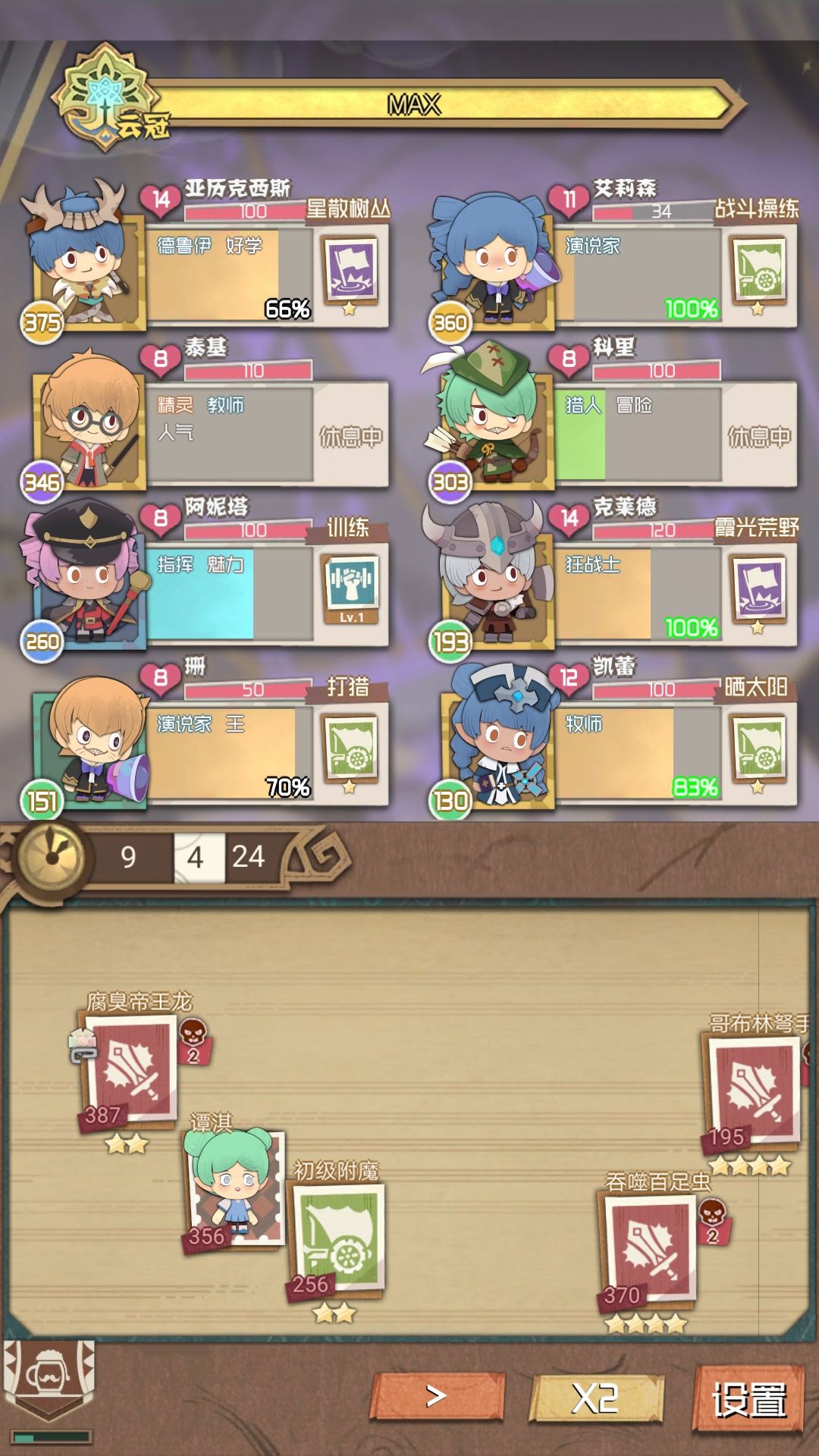 刷了一下午,应该算刷通关了吧?给大家一个套路模板~~指挥+演说家+德鲁伊(参谋)*2+杀手+伤害技能+牧师~~打架的时候先用参谋和德鲁伊帮助演说家刷出技能,出了后全用来刷指挥技能就行了,伤害技能留一个配合杀手刷一刀,牧师技能留一个复活用