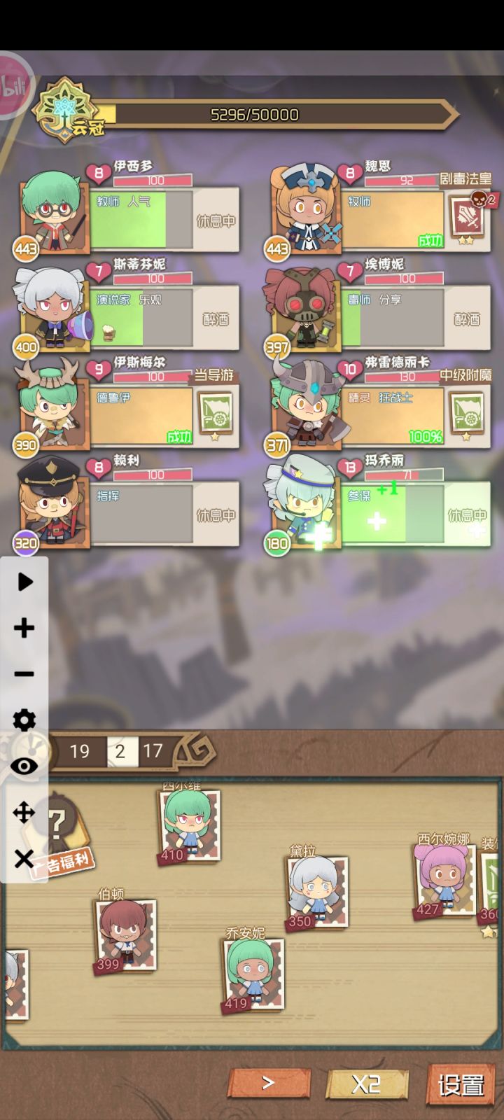 核心就两个职业,杀手和魔术师,各有一个就够了,杀手提供伤害加成,魔术师复制卡牌。其次职业,参谋,多多益善,用于复制更多的杀手和魔术师职业卡牌。再次职业,德鲁伊和演讲者。演讲者一个就够,可以把当前所有职业的进度替换为职业卡牌并小幅加速,方便德鲁伊复制卡牌。德鲁伊不能直接复制职业卡牌,只能复制当前进度卡牌,所以比参谋差一些,优点是能提供少量恢复,可以用演讲者配合使用。玩法很简单,先用第一个参谋复