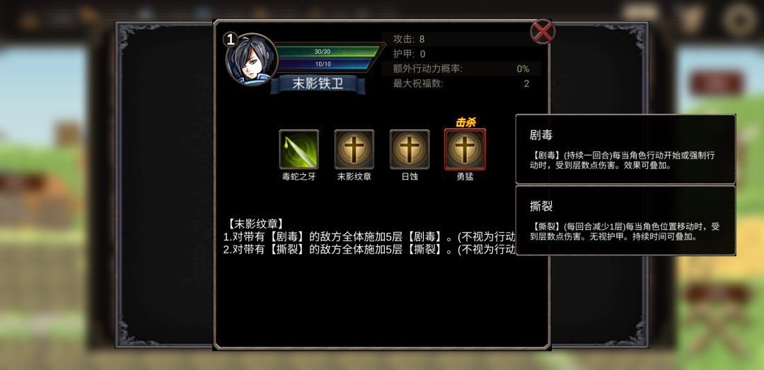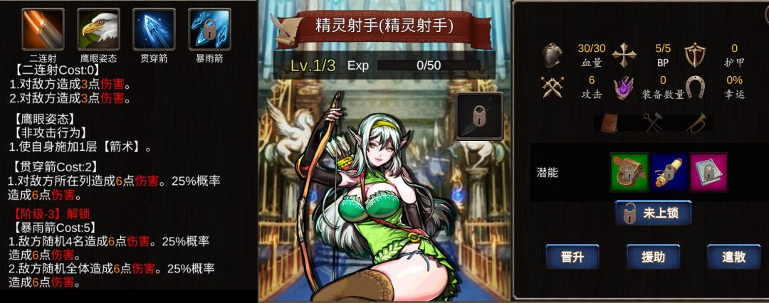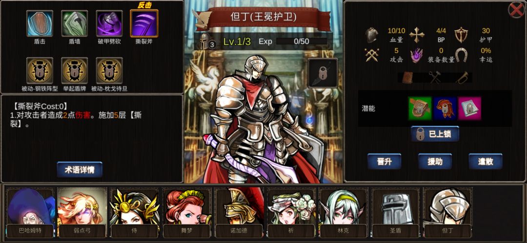 游戏正式更新到现在已经有5天了 因为游戏培养角色成本较高,这边重点讲下潜能刷新和角色自带技能概率问题 就我现在所知,二阶技能有2个可能性的角色 1.西风骑士的2阶技能有举盾(给自己加5点护盾)和圣盾(抵挡一次伤害) 2,禁林哨卫和岩山游荡者二阶技能有,石化皮肤(使自己当前回合无敌,回合结束就消失。注,这个技能比较鸡肋。感觉也就可以免疫撕裂,防止对面反击,就没有了)还有个二阶技能也是举盾 3,然后很
