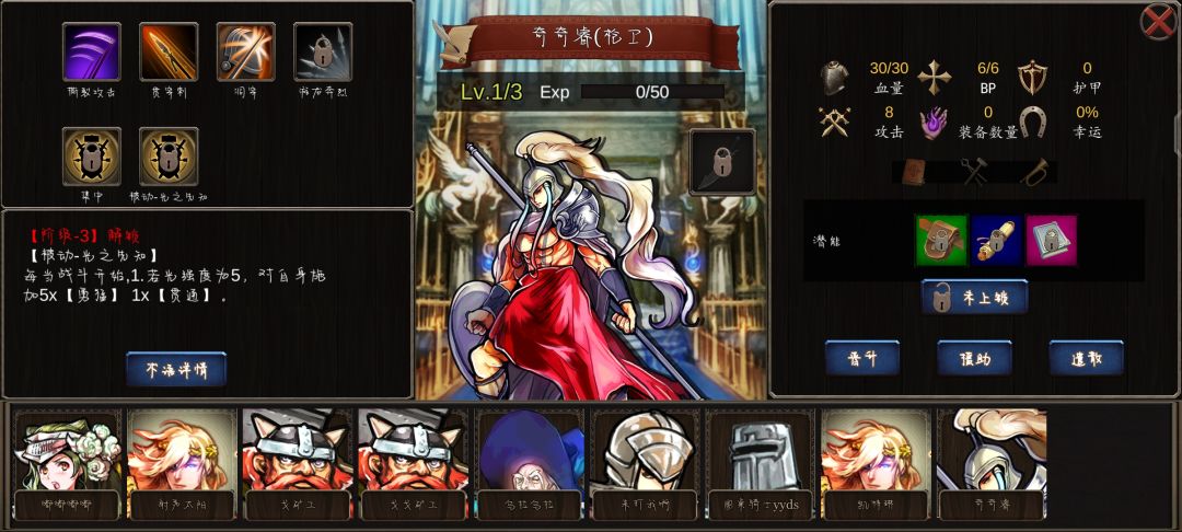通过于几天的水群发现你游的新手引导存在不足之处,导致新玩家入坑时会产生或多或少的疑惑。但由于你游属于个人制作游戏,所以新手教程有所不足是在所难免的。在这里做几个补充,仅针对新手引导,也不全面,还需要大家的补充。至于过关攻略,别问我,我还在被怪蹂躏着呢。 1、布阵。 在这个界面,可以通过直接拖动人物,来进行布阵。 2、人物详细。 人物左上角的信纸图标,查看人物的属性、技能和被动。 3、队伍人数。 队