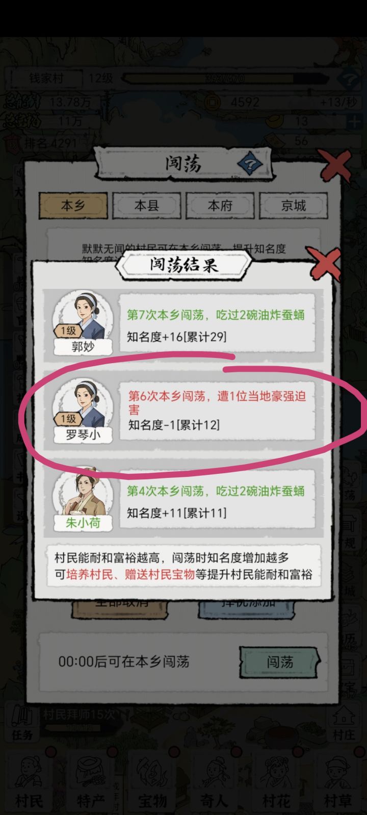 有一些建议,一个是我想直观的看到我有多少村民是正在培养的,多少是已经定居的,名字有点过于随意了,还有村民培养那里一次只能停留一个,必须要隔一会就上才能刷新,这个太麻烦了,还有定居京城的作用太少了点,感觉辛辛苦苦培养出来的人用处却不是很大,希望能增加一些别的功能,还有社交之类的,希望能考虑一下。不过,这真是一个不需要带脑子的游戏!一点也不需要!哪里有红点点哪里!甚至喜结良缘都能多对多!根本不用考虑配置啊名额啊什么的。作为一个挂机游戏来说还是挺好玩的,而且游戏挺大方,感觉不太需要氪,对于我各种零氪党来说很友好。但是很奇怪婚配的成功率是怎么算的,还是怎么可以增加吗?