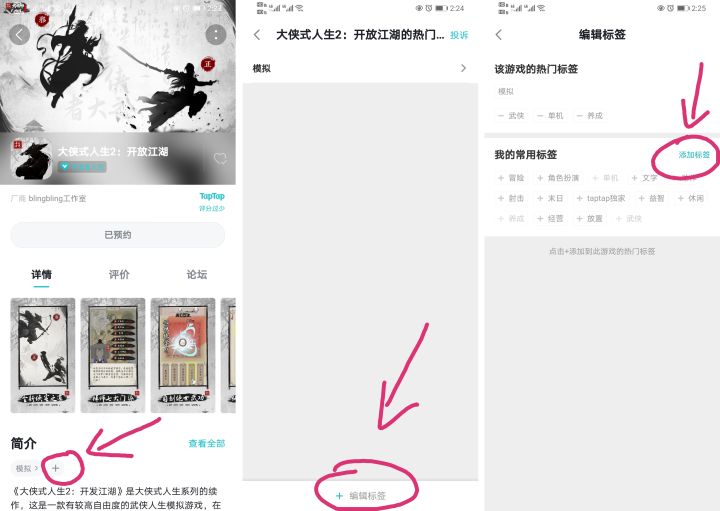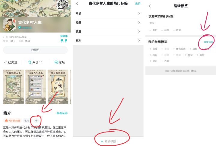 各位小伙伴好!没想到创建了预约界面后也能受到这么多小伙伴的期待和支持,再次受宠若惊!先给各位关注的小伙伴鞠个躬,深表谢意。虽然我们现在精力都在开发知府项目上,但是对于乡村项目我们也想提前多收集大家的想法,所以在此也想劳烦各位感兴趣的小伙伴动动手指帮个忙,到预约页面添加下您觉得想在游戏中体验到的玩法,或者风格、特点等标签(可参考下图由左到右进行操作),我们收到后会做汇总整理,日后尽量在合理范围内让