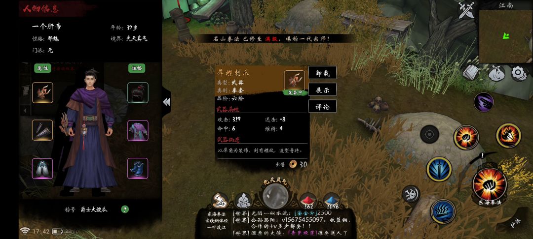 提前说明,我这个攻略和官方给的攻略会有一定差异,大家选择一个自己觉得好的即可主要说开局第一天要做的事情,相信玩过第一天之后大家也会有自己的游戏理解一.开局直接换上双兵去做任务(名山双兵很容易练,属于新手福利武学,其他的刀剑拳枪什么的相比双兵难练很多),在新手村你可以说称王称霸~杀鸡杀狗杀羊杀猪之后~你就可以出城了注意:(1)不要当好奇宝宝非得进后山,那里面是副本,每天只能进10次,不要前期