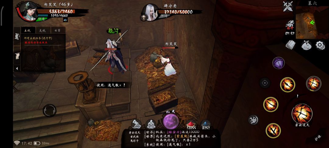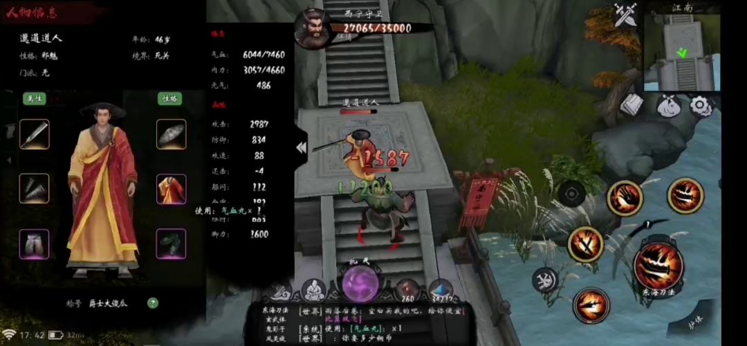 大概是玩到第四天才升到人道,当时的装备很垃圾6阶和尚衣6阶和尚头,其他护腿护腕鞋子什么的都是4阶和5阶的紫装,武器是用铜收的非极品7阶紫剑和7阶紫枪为了省铜属性一般,,借鉴郑笑笑的秦王绕柱人道过二本也不难,最后通关还剩1分30秒。