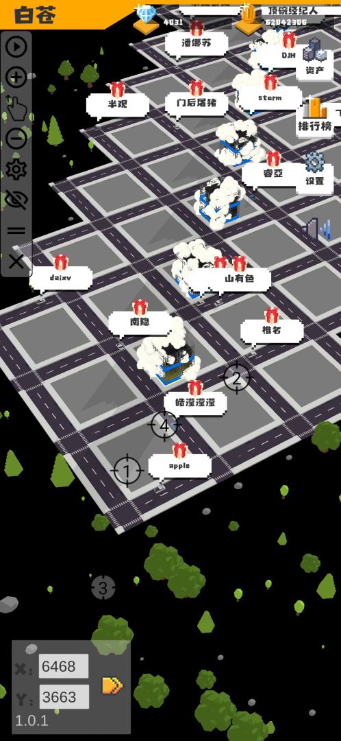 原理为:将建设位置通过放大缩小与角度调整和购买土地的按键重合。点击需要3下,所以1的数量重复3次,然后将2调整到建设按钮,因为卡顿,所以2需要调整间隔时间较长3什么好说的,直接建设。4是通过3后建设会产生卡顿的原理而无法选中区块,而在卡顿时被跳过,然后在被小车卡死时因为3没有启动而没有卡顿而点击取消按钮。将小车界面取消。但是如果卡顿时间过短就会产生被4成功按下地板砖的情况,这个效果就通过1的购买来消除。但又因为1需要三下按钮,而被4的失误消耗了一下按钮从而导致1没有按出地块的建设界面,而导致2也点击了地面,导致又需要买地产生的死循环,所以我通过将1的点击次数增加的方式来跳过死循环,所以1的数值为4。